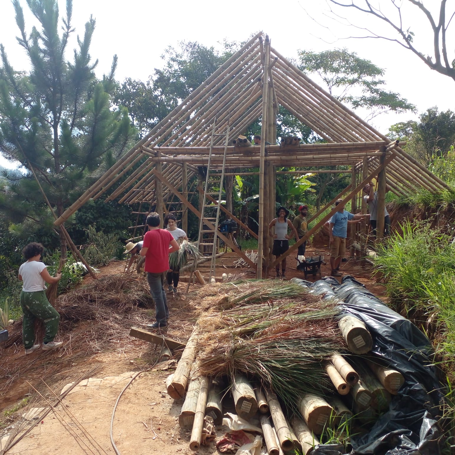 Os materiais construtivos em utilização são originários do próprio território, com estrutura de eucalipto roliço, telhado de fibras naturais, chamado de sapê e as paredes são de 4 técnicas construtivas sustentáveis: taipa de mão, taipa de pilão, adobes e blocos de resíduo comprimido. São métodos construtivos de baixo impacto ambiental, e geram renda para os construtores locais, ao passo que são técnicas tradicionais da história das culturas construtivas populares do Brasil