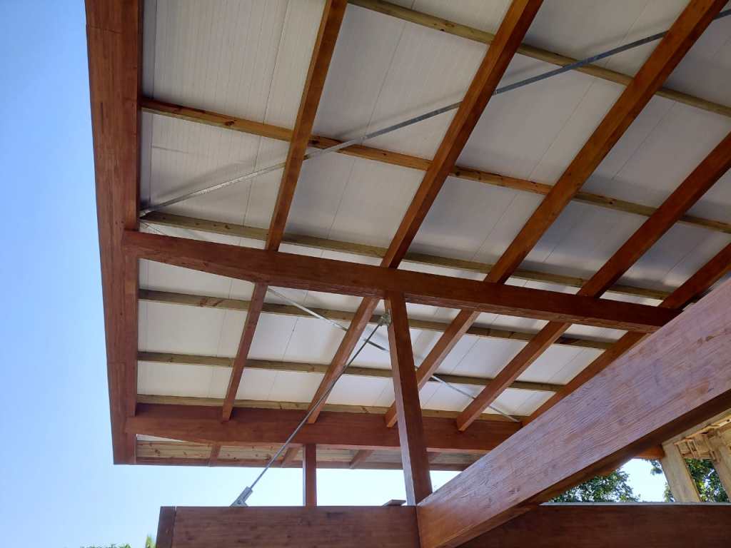 A escolha pela estrutura de madeira laminada deve-se ao compromisso com uma obra limpa e ecologicamente responsável. Os elementos estruturais são todos aparentes, compondo a sinceridade estética da arquitetura.